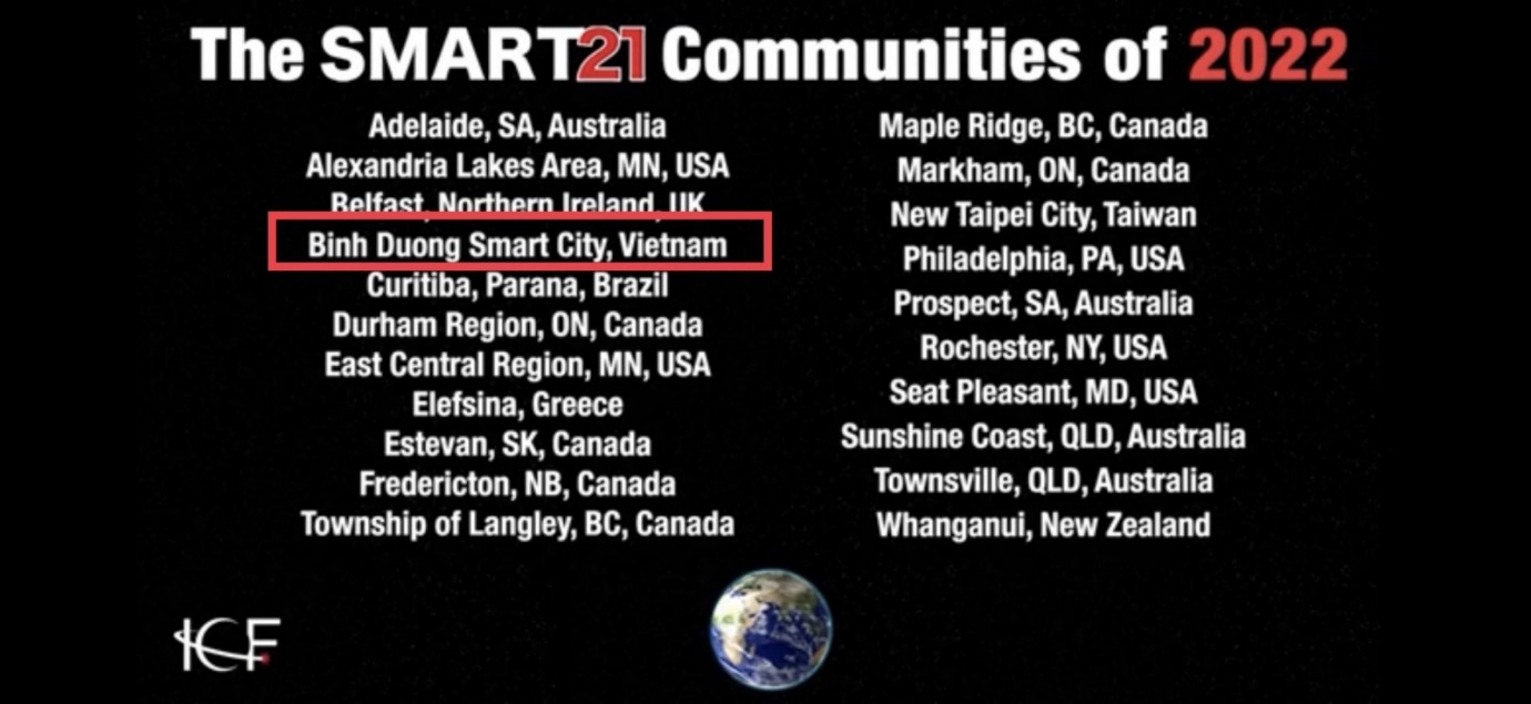 Theo ICF - diễn đàn gồm gần 200 đô thị thông minh thịnh vượng thế giới, Bình Dương phát triển tốt ở cả 6 tiêu chí bao gồm: Kết nối - Băng thông rộng; Lực lượng lao động; Đổi mới sáng tạo; Bình đẳng tiếp cận kỹ thuật số; Ủng hộ khích lệ và phát triển bền vững. Thủ phủ công nghiệp có sự gắn kết chặt chẽ giữa "ba nhà" gồm: nhà nước - nhà khoa học (trường, viện nghiên cứu) - nhà doanh nghiệp.